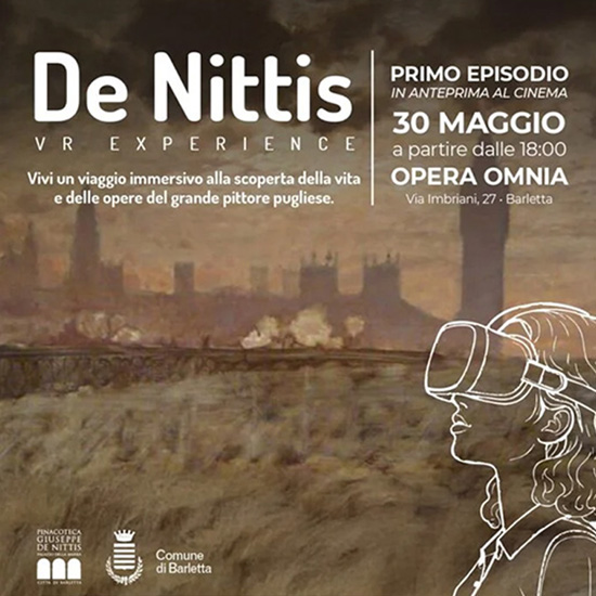 Produzione di un cortometraggio immersivo a 180° realizzato per il Cinema Opera Omnia di Barletta. Il progetto è concepito per la fruizione tramite visori VR in una sala cinema, offrendo agli spettatori un’esperienza coinvolgente in un ambiente ibrido che integra ricostruzioni 3D e riprese video dal vivo. Il primo episodio è dedicato al suo periodo londinese, esplorandone la vita e l’opera attraverso un linguaggio audiovisivo innovativo. Si tratta del primo capitolo di una serie che mira a raccontare l’intero percorso artistico del celebre pittore.