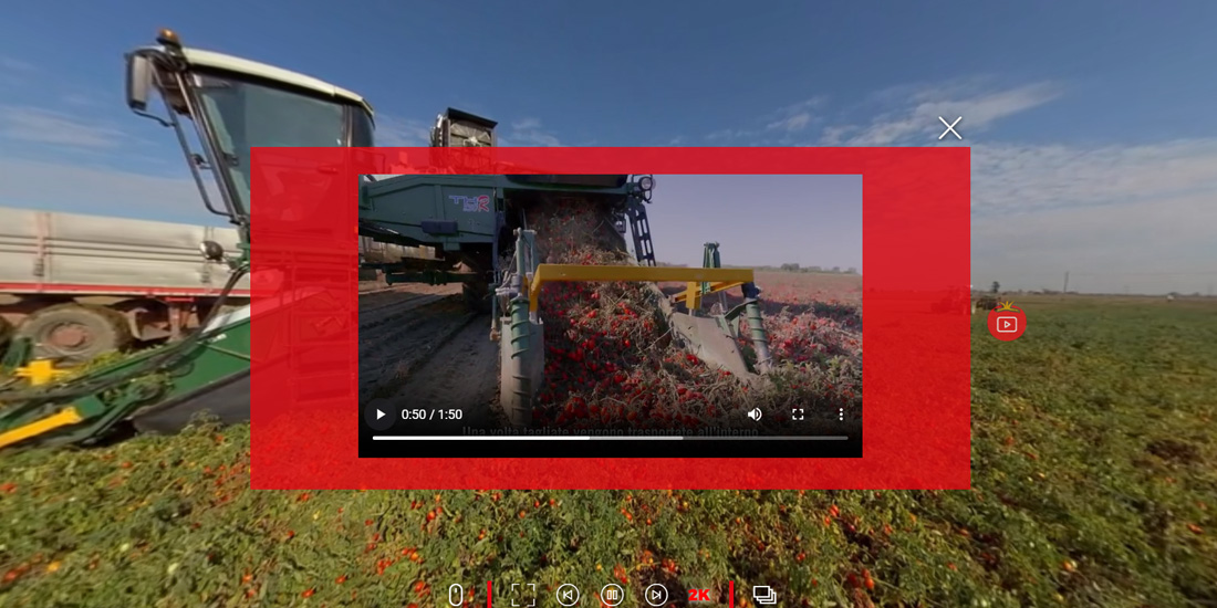 Un percorso virtuale che digitalizza filiera e processo produttivo del mondo Mutti S.p.A. Un’esperienza immersiva basata sulla piattaforma proprietaria Experientia che parte dal campo per raggiungere lo stabilimento tra eccellenza della materia prima, innovazione dei processi, step dedicati alla verifica qualitativa del prodotto e packaging. Uno strumento tecnologicamente avanzato, realizzato tramite video 360° statici e dinamici, utilizzato per comunicare ai buyer di tutto il mondo i valori aggiunti del Red Tour in modo semplice ma al contempo tecnico e dettagliato grazie alla presenza di hotspot multimediali di approfondimento.