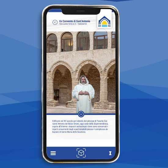 Il progetto, realizzato per la Soprintendenza dei Beni Culturali e Subacquei di Taranto, ha una grande portata in termini d’innovazione tecnologica. L’obiettivo è rendere accessibile il patrimonio storico e culturale dell’Ex-Monastero utilizzando un’applicazione AR bilingue per accedere a contenuti esperienziali, ricostruzioni 3d durante la visita in loco o esplorare con un Cicerone virtuale la città di Taranto. Un docufilm con una compagnia di teatrale di rilevanza internazionale e contenuti video 360° hanno arricchito ulteriormente l’esperienza.